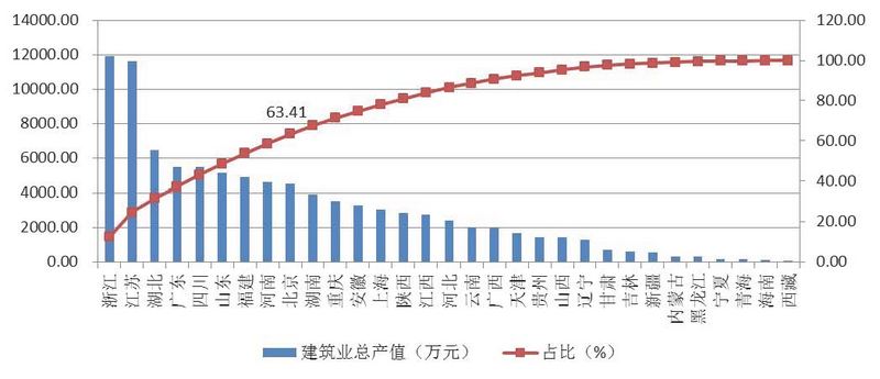 除浙江、江蘇兩省外,總產(chǎn)值超過4000億元的還有湖北、廣東、四川、山東、福建、河南和北京共7個(gè)地區(qū),上述9省市完成的建筑業(yè)總產(chǎn)值占全國建筑業(yè)總產(chǎn)值的63.41%。